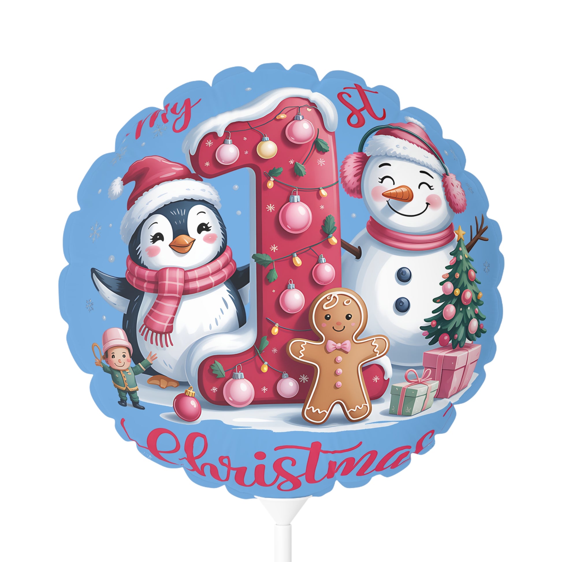 Softly festive and playfully joyful, this 11" round mylar balloon transforms first-Christmas moments into a tiny, rewatchable scene. A rosy number one sits twinkling at the center, surrounded by a waddling penguin, a smiling snowman, a gingerbread friend and tiny gifts—snowflakes drifting across a powder-blue matte background. It feels like a cozy morning: little feet padding across a living room, the quiet sparkle of tinsel, and a parent’s laugh as baby reaches up. Lightweight and reusable, the balloon arrives ready on a stick for tabletop displays or nursery photos. It holds color through wintry days and can be deflated and stored for next year’s memories.